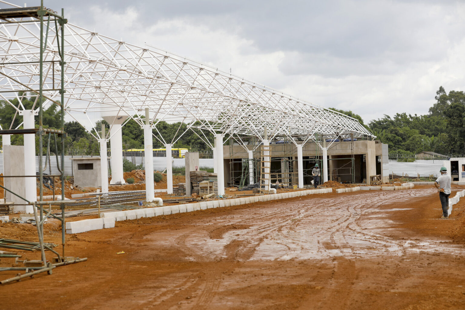 Serviços de hidráulica, prevenção contra incêndios e drenagem já foram finalizados; equipes trabalham na terraplanagem, cobertura e construção de salas administrativas
